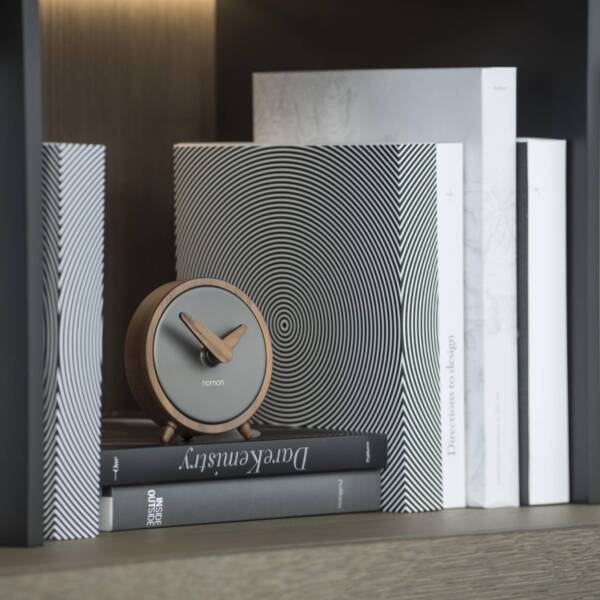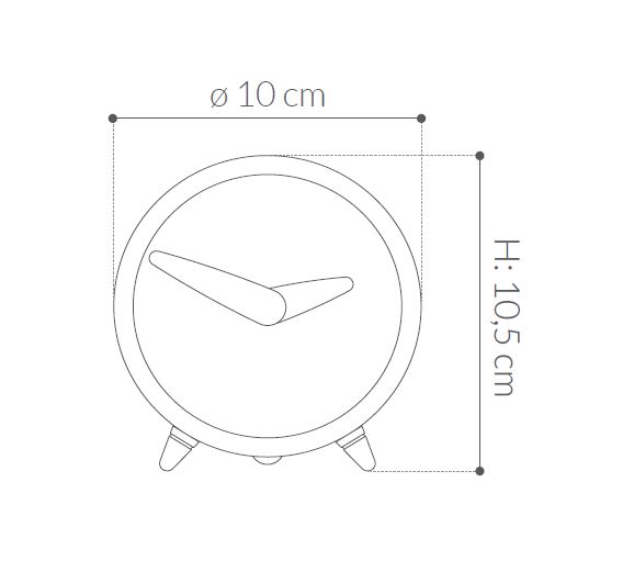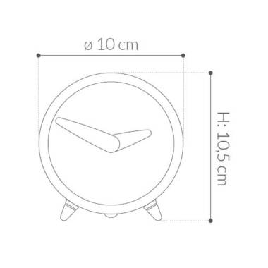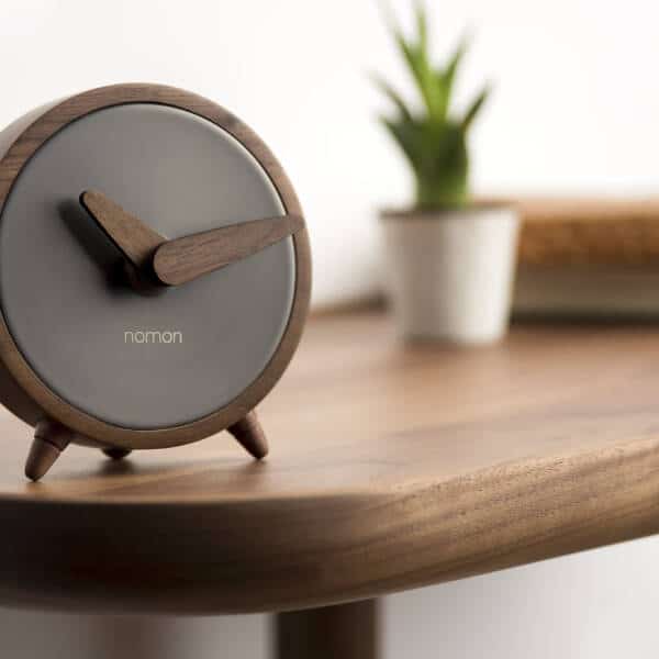 Stoni sat dimenzija Ø 10 cm, H 10,5 cm. Metal grafit, drvo orah.