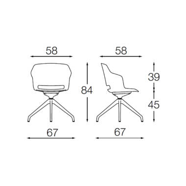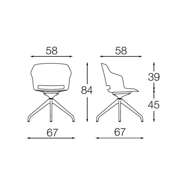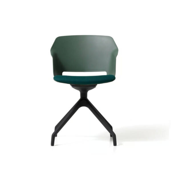 Stolica dimenzija 67 x 67 x 84 cm sa sjedištem i naslonom u formi školjke od polipropilena u zelenoj boji (VE). Sjedište punjeno hladno livanom pjenom i tapacirano visokokvalitetnim štofom kategorije G, boja zelena (496). Baza u formi 4-krake “spider” aluminijumske zvijezde lakirana epoxy prahom u crnu boju. Mehanizam zaokretni, bez hidraulike. Dimenzije stolice 67 x 67 x 84 cm; visina sjedišta 45 cm.