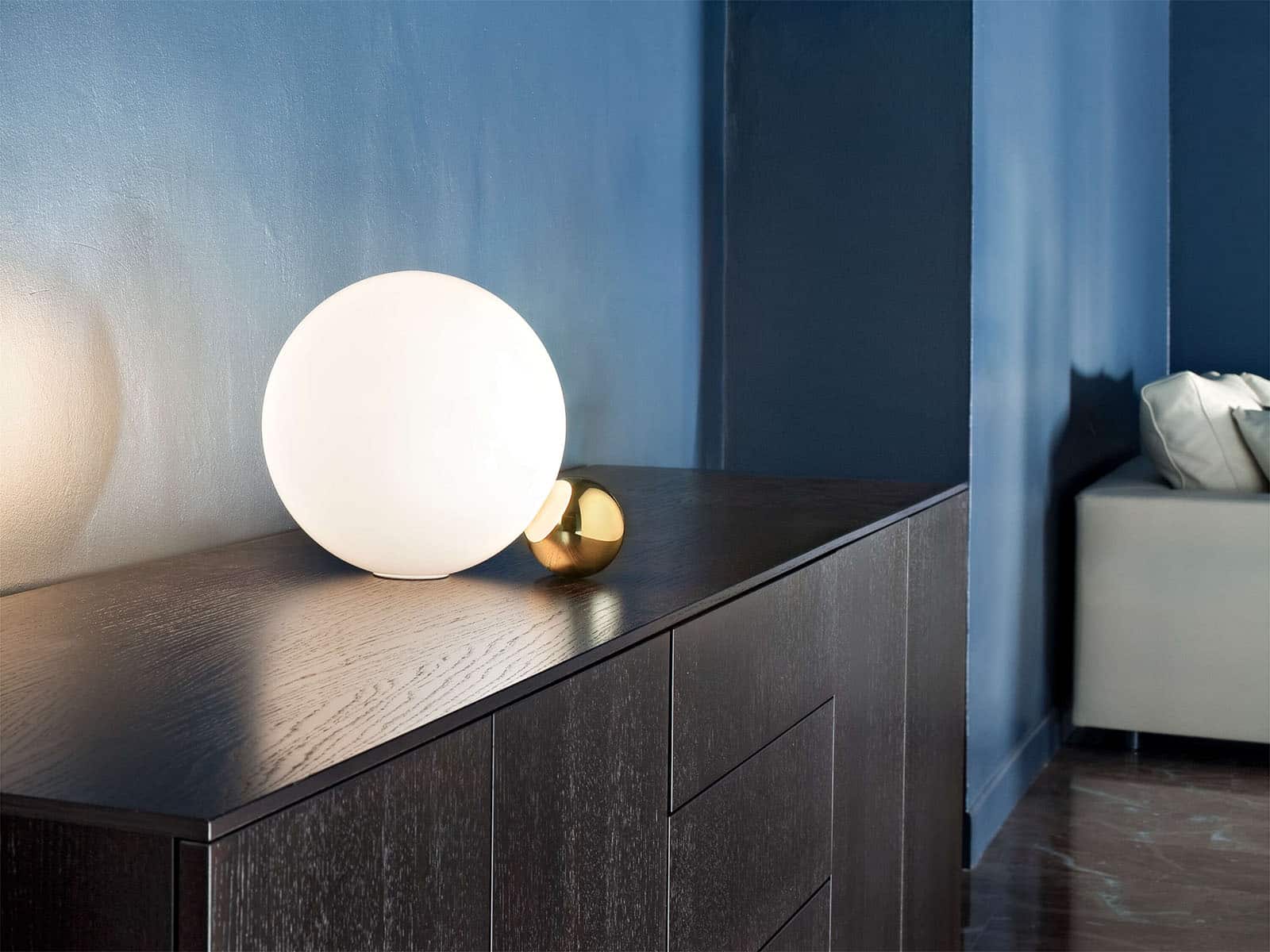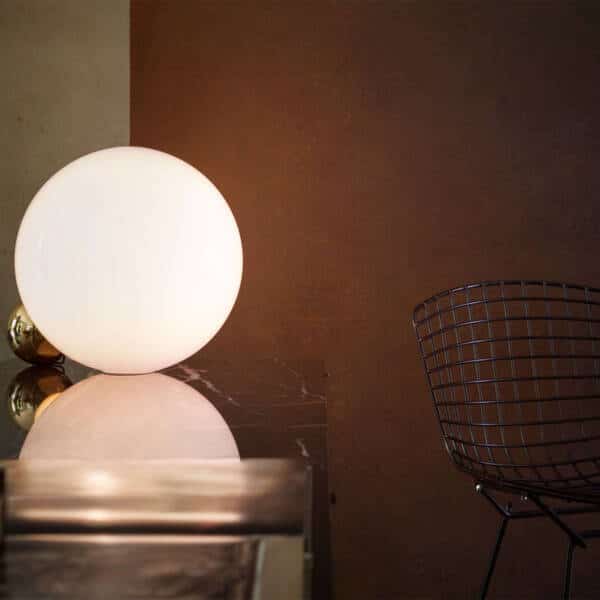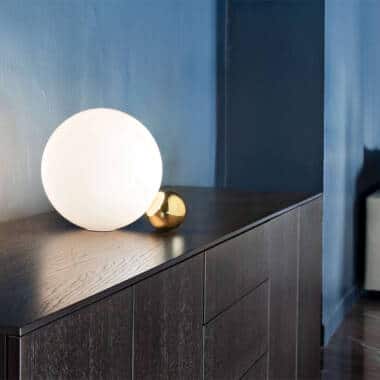 Stona lampa dimenzija Ø 30 cm. Aluminijum zlatne boje, ručno duvano staklo.