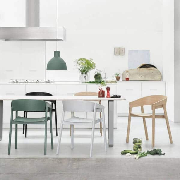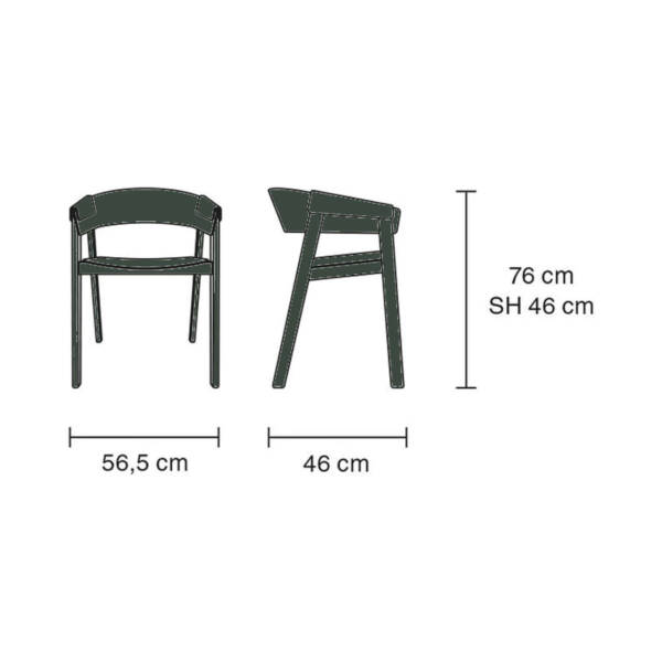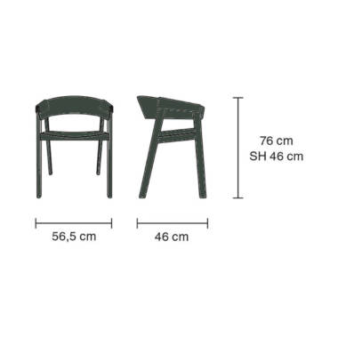 Baza u formi 4 drvene noge od bukve u zelenom laku. Sjedište, naslon i rukonaslon od termotretiranog i savijenog furnira bukve u zelenom laku. Stolice su samo za unutrašnju upotrebu. Dimenzije stolice 56 x 50 x 76 cm.