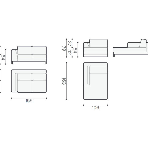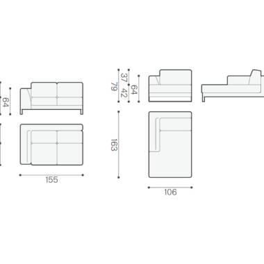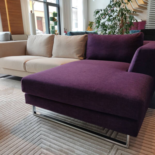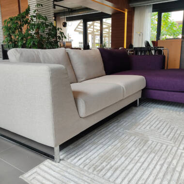 Ugaona, kompletna struktura od punog drveta. Sjedite od višeslojne poliuretanske pjene. Jastuci punjeni mješavinom perja i pamuka. Tapacirana visokokvalitetnim štofom Super 30285 i 30280, bež i ljubičaste boje, sastav 100% poliester. Svi šavovi zatvoreni. Nogice hromirane metalne, visine 13 cm. Dimenzije ugaone 261 x 163 x 79 cm; visina sjedišta 42 cm.