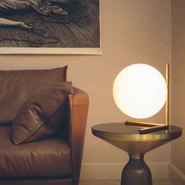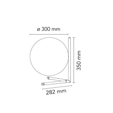 Stona lampa dimenzija Ø 30 cm, h 35 cm. Aluminijum mesing boje, ručno duvano staklo.