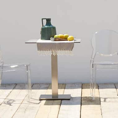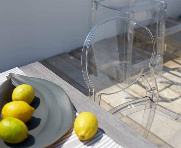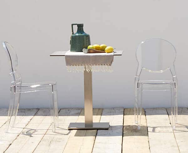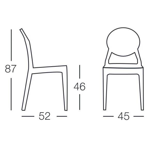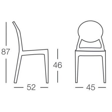 Dimenzija stolice 45x52x87h cm. Visina sjedišta 46 cm. Stolica od polikarbonata. Boja transparentna, zadimljena (fume).