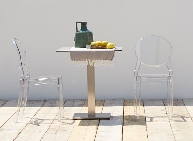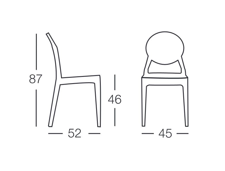 Dimenzija stolice 45x52x87h cm. Visina sjedišta 46 cm. Stolica od polikarbonata. Boja transparentna, zadimljena (fume).