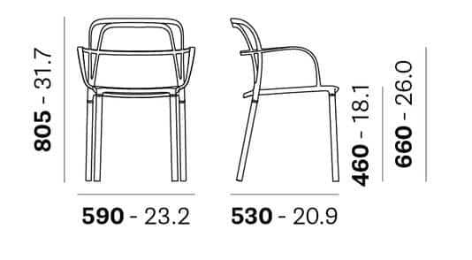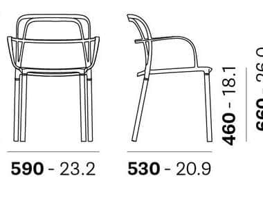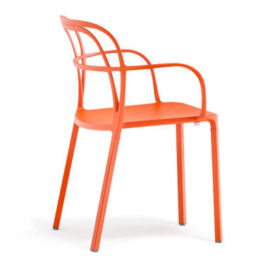 Dimenzija stolice 59x53x80.5h cm. Visina sjedišta 46 cm. Kompletna stolica od metala. Boja narandžasta. Pogodna za vanjsku i unutrašnju upotrebu.
