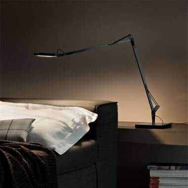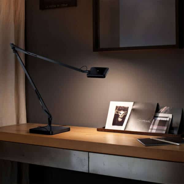 Stona lampa dimenzija 58 x 17 x 48 cm od aluminijuma lakiranog u crnu mat boju.