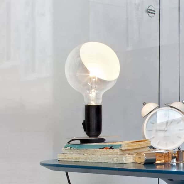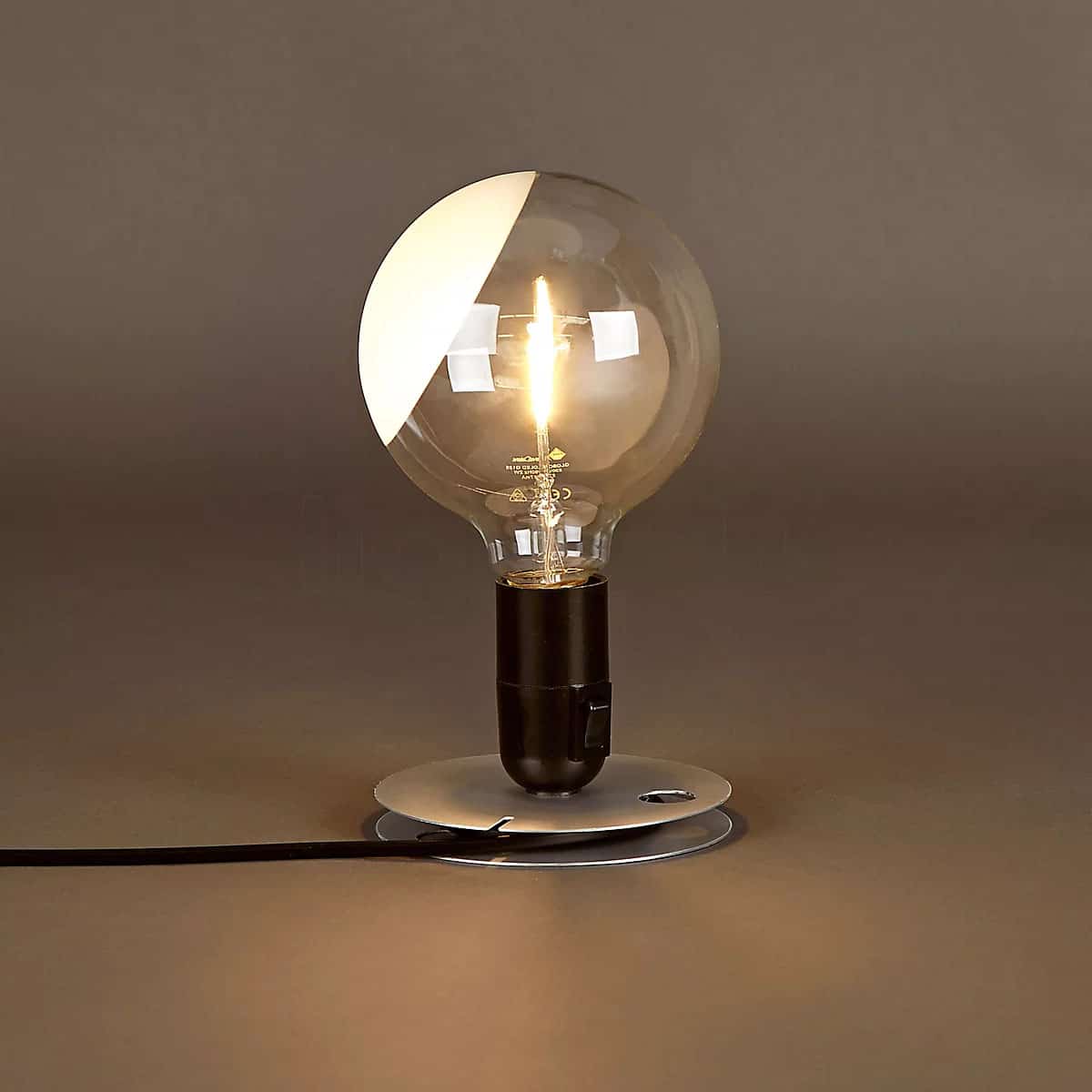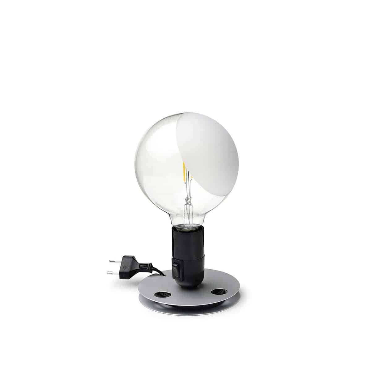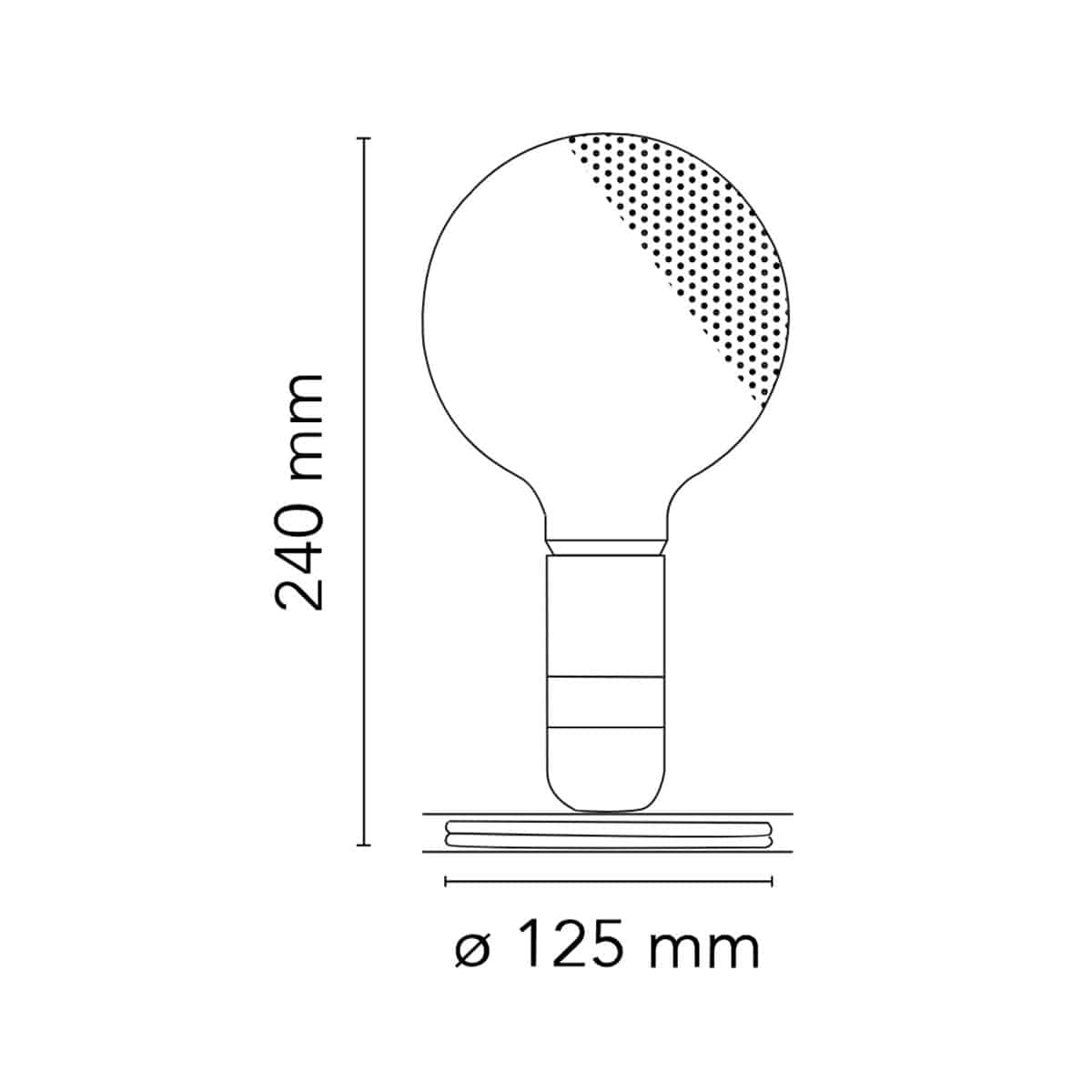 Stona lampa dimenzija Ø 13 cm, h 24 cm. Aluminijum natur, plastika crna, staklo prozirno djelimično pjeskareno.