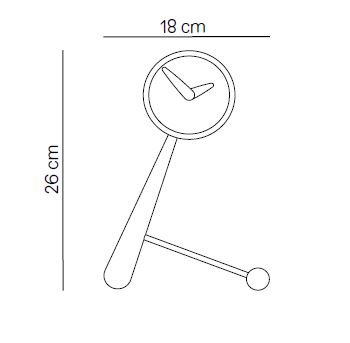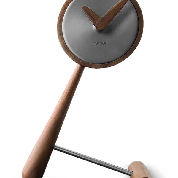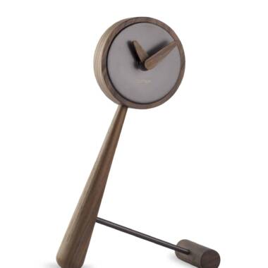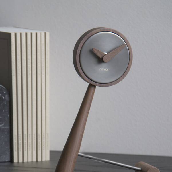 Stoni sat dimenzija 18 x 7 x 26 cm (ŠxDxV). Metal polirani mesing, drvo orah.