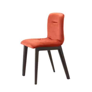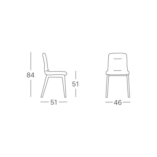 Baza u formi 4 drvene noge od bukve u tamnom bajcu (FK). Sjedište i naslon punjeni hladno livanom pjenom i tapacirani vodootpornim štofom (V4 44). Stolice su samo za unutrašnju upotrebu. Dimenzije stolice 46 x 51 x 84 cm.