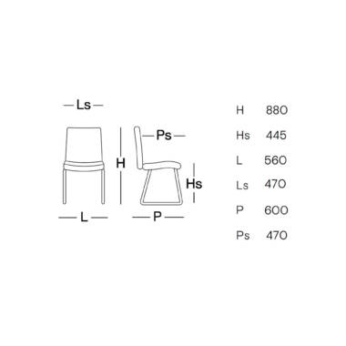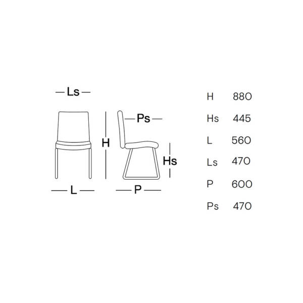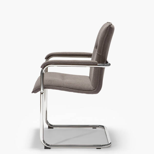 Konferencijska stolica sa hromiranom bazom i ramom u formi skija od okrugle cijevi Ø 25 mm. Sjedište i naslon u formi školjke sa konstrukcijom od šperploče punjeni hladno livanom pjenom, tapacirani eko-kožom kategorije 300 bež boje (385 Tortora). Rukonasloni sa tapaciranim jastučićem. Dimenzije stolice 56 x 60 x 88 cm.