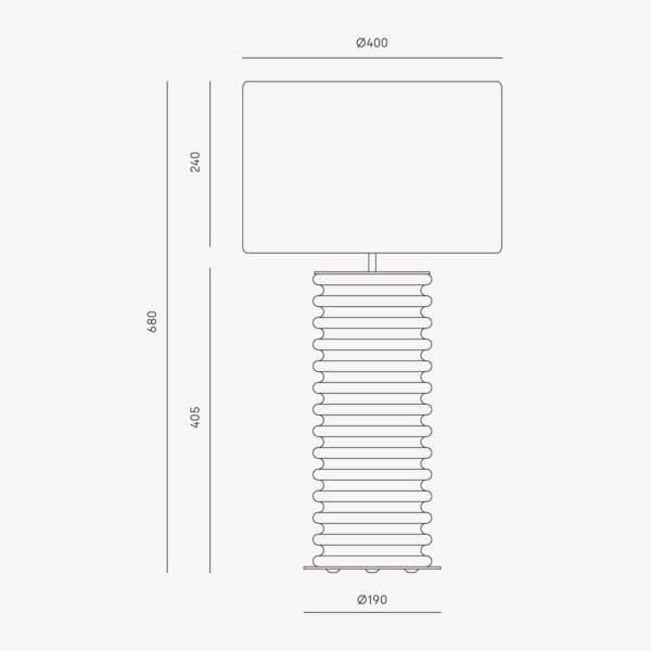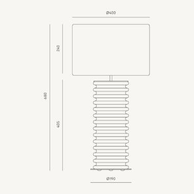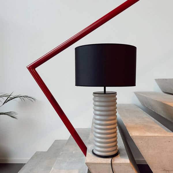 Stona lampa dimenzija Ø 40 cm, h 68 cm. Metal mat crni, keramika siva, abažur crni.