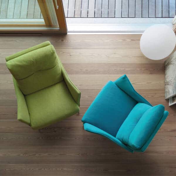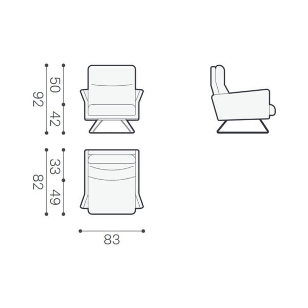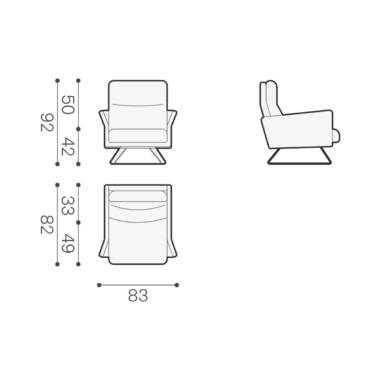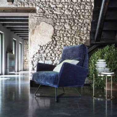 Baza fotelje metalna od cilindričnih cijevi lakiranih u crnu boju. Sjedište i naslon sa podkonstrukcijom od masivnog drveta punjena poliuretanskom pjenom i poliestarskim vlaknima, sa završnim slojem perja, tapacirana štofom kat. Extra plave boje 0041. Dimenzije fotelje 83 x 82 x 92 cm.